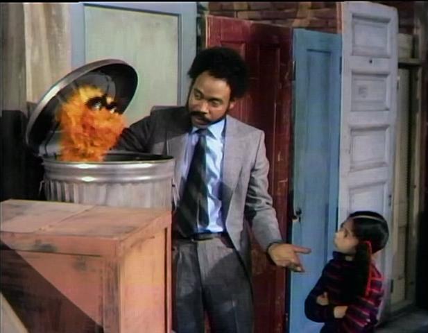 SCENE 3 | Gordon directs Sally to a noisy trash can, the home of Oscar the Grouch. Gordon knocks on Oscar's can so he can introduce him to Sally, but he refuses to come out. After Gordon knocks again, Oscar finally meets Sally and already takes a liking to her because, in the short time they've met, she hasn't banged on his can or "bugged me in general... which is more than I can say about some people I know!" |