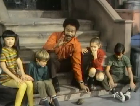 CLOSING SIGNS | A group of Muppet hippies (including a bearded hippie) hold up the Sesame Street sign, while Mr. Hooper holds up the Children's Television Workshop sign. |