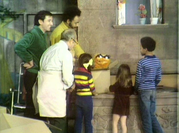 SCENE 6 | Mr. Hooper, Gordon, and the kids have unpacked box after box from the big box and finally come to the last box, which is wrapped in brown paper. They unwrap the box, and out pops Oscar, who was hoping to get some peace and quiet. Gordon assures him that no one will disturb him again; they write on the box "Grouch sleeping. Do not disturb!" |