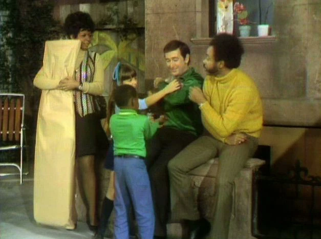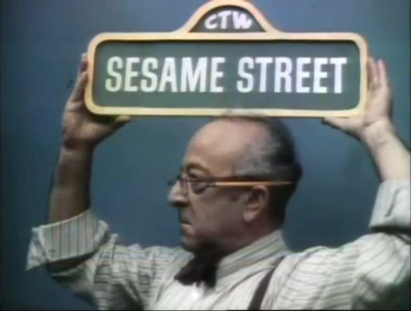 CLOSING SIGNS | Mr. Hooper holds up the Sesame Street sign, while Gordon and Susan hold the Children's Television Workshop sign. |