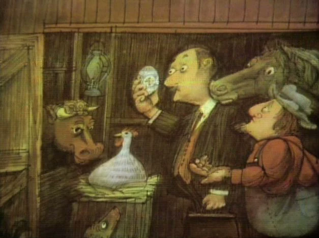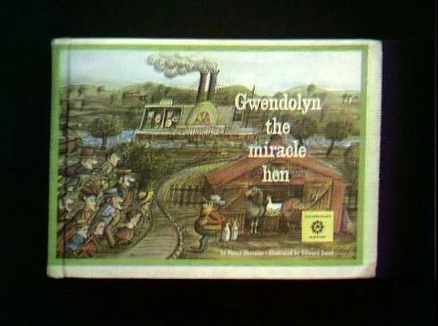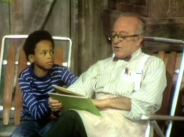 SCENE 10 | Mr. Hooper reads Gwendolyn, the Miracle Hen by Nancy Sherman to Jay. The story is about a hen who lays beautiful eggs that help pay the rent. |