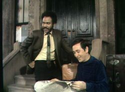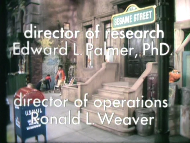 CLOSING SIGNS | Ernie and Bert hold up the Sesame Street sign, while Mr. Hooper and Bob hold up the Children's Television Workshop sign. |