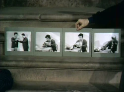 SCENE 7 | Bob arranges some picture sequences of Buddy, and has Sarah guess which order they go in. The first sequence is of Buddy going down a slide; the second is of Buddy opening a present. |