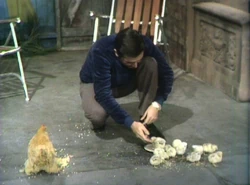 Big Bird stops by, and greets one of the chicks as Egbert - a setup for a bad joke he heard from Ernie. Big Bird is glad he's not a chicken, because chickens can't talk. Bob sings "Chickery Chick," about a chick who decides, instead of saying "chick" or "peep," decides to invent his own things to say. |