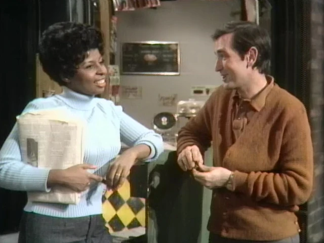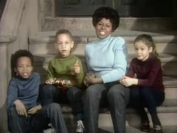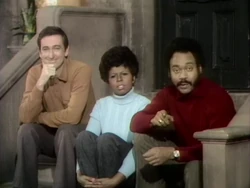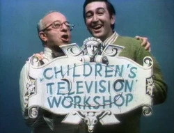 CLOSING SIGNS | Gordon and Susan hold up the Sesame Street sign while Mr. Hooper and Bob hold up the Children's Television Workshop sign. |