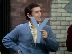 Big Bird uses what he's learned about the shapes of the letters to tell a story to remind him what he's forgotten. The story involves a robber stealing a chair and breaking its legs off (making it look like an L), another robber stealing a bag of eggs (which looks like a U when empty), and the two of them bumping into each other at a Y-shaped fork in the road. He recognizes each of the shapes... and forgets the letter's names. Gordon thinks it would be a good time to visit Buddy and Jim. |