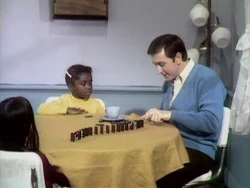 SCENE 2 | While Susan waits for Gordon in the kitchen, Bob, Cheryl, and Sumiko play with a set of dominoes. He counts four dots on one of them. |