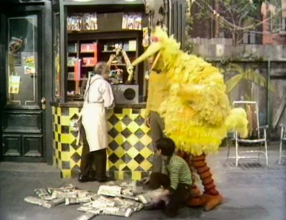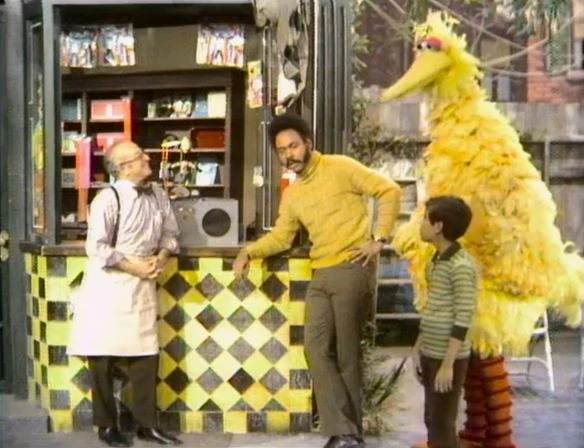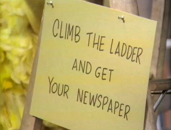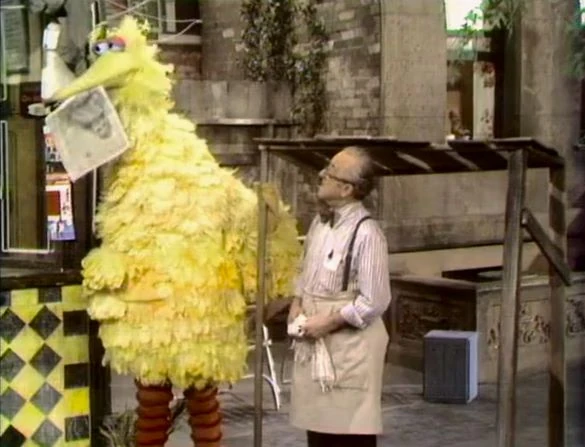 SCENE 4 | Big Bird has finished building a newspaper stand for Mr. Hooper, which is much taller than Mr. Hooper expected, since Big Bird is so big. Big Bird, however, has come up with a solution: a ladder to get to the top. Mr. Hooper notes how complicated this is just to get a newspaper, which Big Bird acknowledges. |