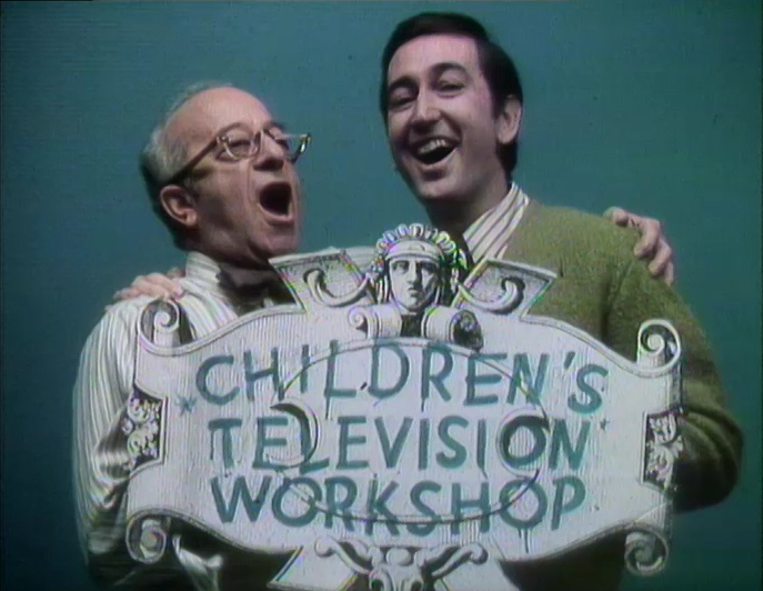 CLOSING SIGNS | Ernie and Bert hold the Sesame Street sign, and Mr. Hooper and Bob hold the Children's Television Workshop sign. |
