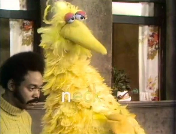 SCENE 1 | Gordon is about to pick up his newspaper from Hooper's Store, when he looks up and sees Alphabet Bates skywrite the letter N (First: Episode 0040). He asks Big Bird and Carlos if they know any N words. Big Bird thinks of his neck, and Carlos thinks of his nose. |