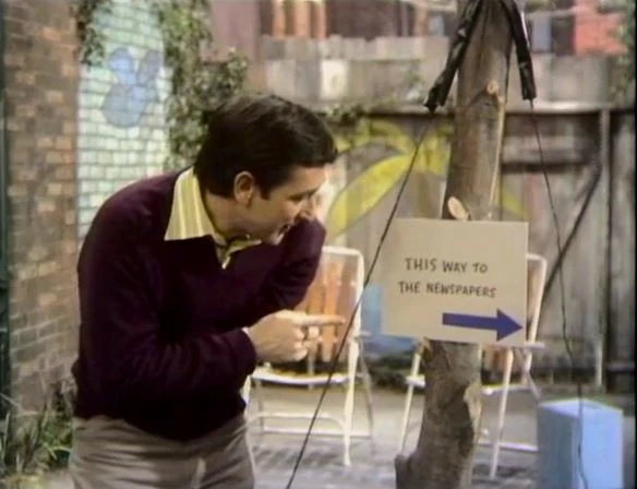 Gordon also remembers that N is for newspaper, then notices that the newspaper stand is missing. Mr. Hooper has just replaced the old-fashioned stand with his new invention: Hooper's Super Duper Newspaper Machine. Mr. Hooper demonstrates it by having Gordon ask for a paper. With the turns of the dials and a push of the button, the machine reveals a gold-gloved hand that tosses him a rolled-up newspaper. After getting a second paper, the machine goes haywire, and the hand begins tossing out newspapers everywhere. Big Bird counts seven of them. |