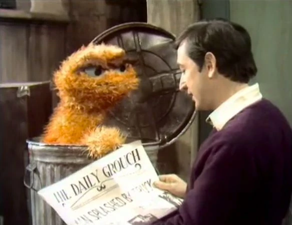 SCENE 5 | Bob follows a group of signs with arrows pointing from Hooper's Store to Oscar's can. Oscar is selling copies of The Daily Grouch while Hooper's is out of the newspaper business. The grouch newspaper contains stories of grouchy things happening, such as a man getting drenched by a speeding truck and ants spoiling a picnic. One story sounds much happier, but it's incomplete as the Daily Grouch doesn't cover good stories. |