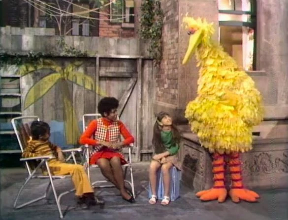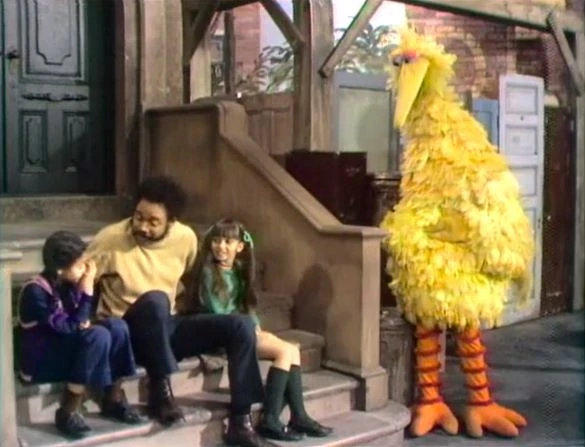 SCENE 1 | On the steps, Gordon plays a guessing game with Roma and Patty, where they both cover their eyes and guess what sounds they hear. They hear the sounds of traffic, a plane, an ice cream truck, and clumsy Big Bird crashing into something. |