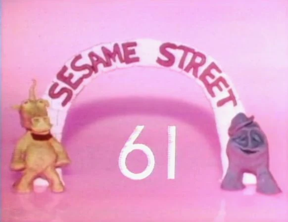 CLOSING SIGNS | Bert and Ernie hold the Sesame Street sign, and Cookie Monster holds the Children's Television Workshop sign. |