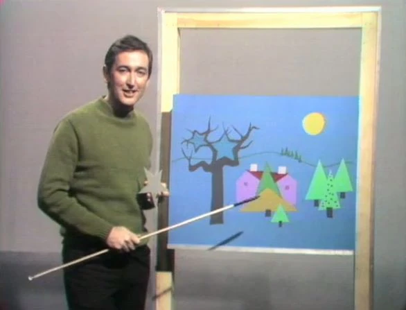 SCENE 4 | Bob demonstrates what a star looks like with a cut-out shape. He has the viewer look for the stars in a picture of a house surrounded by trees; by "magic," the stars light up for a better look. Susan also knows a song with a star in it. |