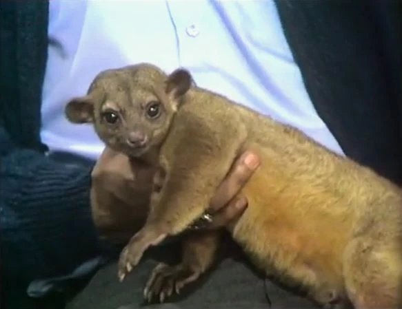SCENE 3 | Gordon displays a kinkajou, which can live in any climate. He tells Rhonda he got it from South America, and the two of them feed it a banana. "Chiquita Banana would be proud of you," Gordon tells the kinkajou, and introduces a film of another warm climate animal. |
