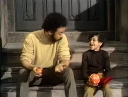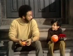 CLOSING SIGNS | Bob holds the Sesame Street sign, and Gordon holds the Children's Television Workshop sign. |