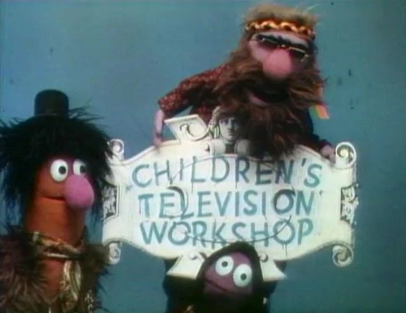 CLOSING SIGNS | Gordon holds the Sesame Street sign, and a bunch of Muppet hippies hold the Children's Television Workshop sign. |