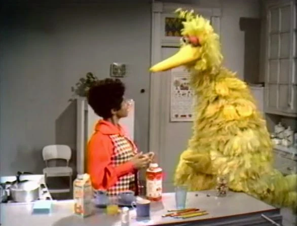 SCENE 7 | In the kitchen, Big Bird spills some milk, making the counter wet. After Susan cleans it up, Big Bird spills a little bit of candy, thinking he made the counter wet again. Susan explains the difference between wet and dry using various items. |