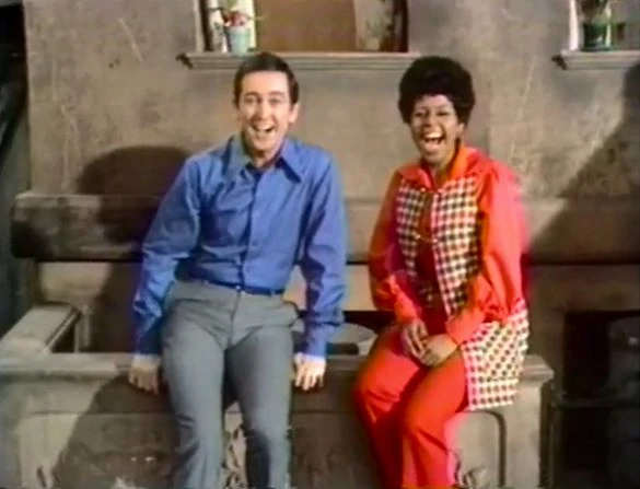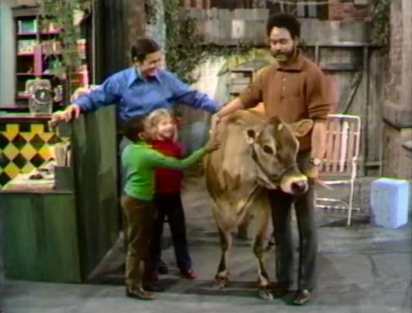 CLOSING SIGNS | Bob holds the Sesame Street sign, and Gordon and Susan hold the Children's Television Workshop sign. |