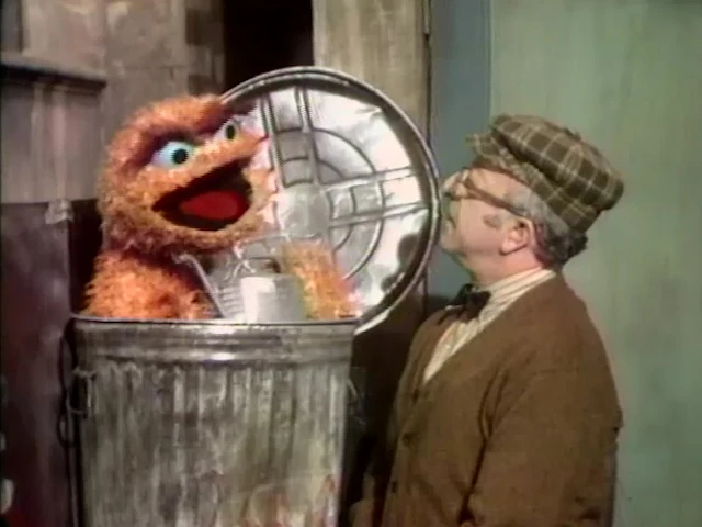 SCENE 8 | Mr. Hooper stops by Oscar's trash can to ask him if he'd like to see an upcoming movie. Oscar says he doesn't have time because he's busy watering his flowers, filling his swimming pool, drinking a glass of water, and adjusting his fountain. Mr. Hooper says if he's doing all those things with water, he should really see this movie, but Oscar says he hates water. |