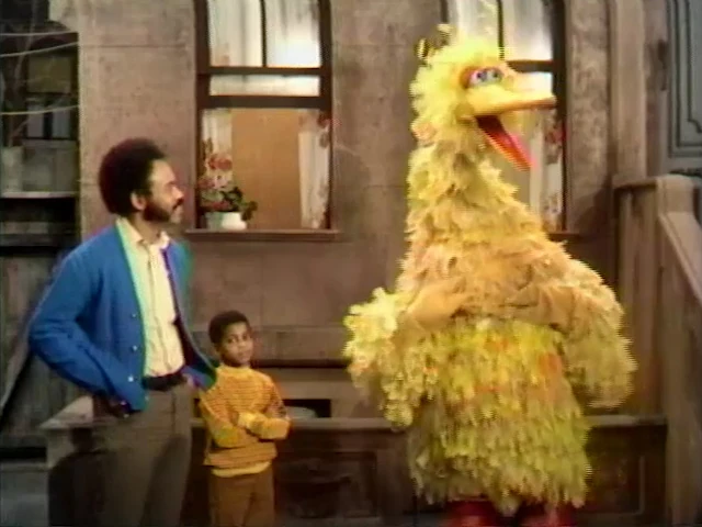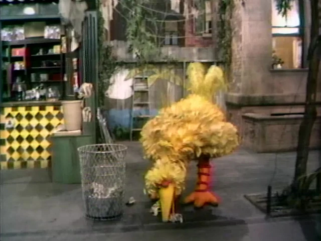 SCENE 2 | Big Bird dumps some trash out for Mr. Hooper, but drops some pieces on the ground by accident. After he picks them up with his beak, the last piece of paper eludes him by jumping around the yard. He explains to Mr. Hooper what's been happening, but when he tries to demonstrate, he picks it up with no problem. Ready to throw it in the trash now, the waste basket begins moving away from him. |