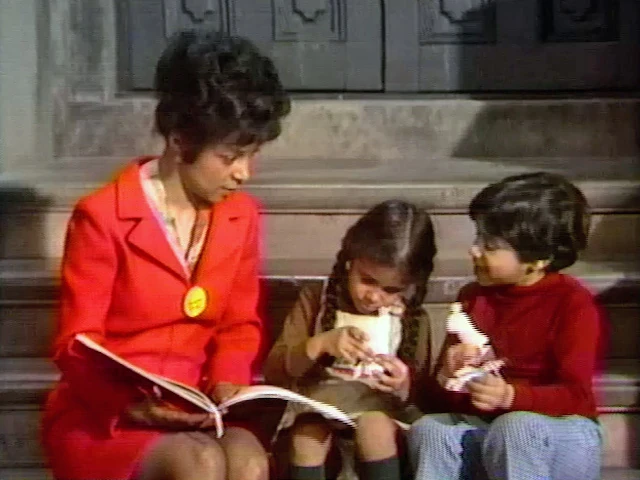 SCENE 4 | Susan introduces Ruby Dee who sits on the steps of 123 Sesame Street with Lance and Troy. She hands them paper cutouts of characters from a book she's going to read them called Moving Day for Manuel by Ruth M. Baylor. |