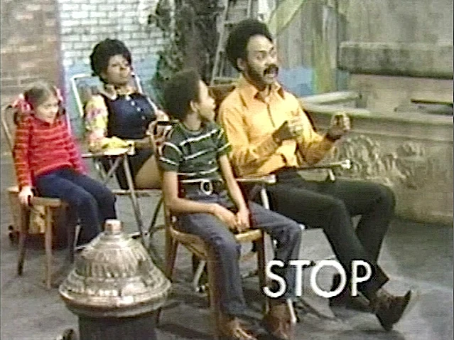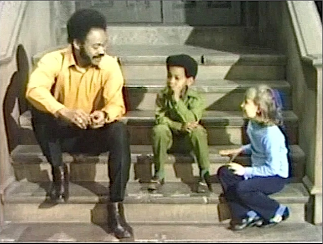 SCENE 4 | Sitting on the steps, Gordon asks some kids what they would see if they were driving on the road. They discuss the purpose of license plates, and Gordon displays some fake license plates so they can practice reading them. He makes sure they know which letter was featured on all three of them. |