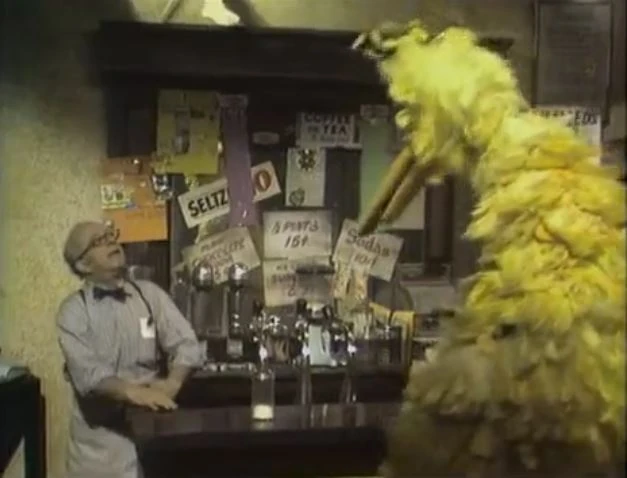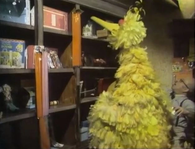 Mr. Hooper finishes putting the pencils away, but now Big Bird tells him why he stopped by in the first place... he wants to buy a pencil. Mr. Hooper laments, "Why? Y?" | |