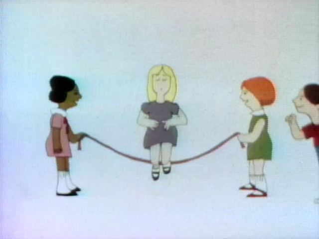 Film | Girls play a jump rope alphabet game: “I’ve got an A in my ankle, I’ve got a B in my back,” etc. A boy wants to play, but one of the girls says the game is for girls only. Finally, when he contributes “I’ve got a Z in my zebra,” one of the girls says he can play. (First: Episode 0030) |