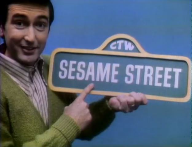 CLOSING SIGNS | Bob holds the Sesame Street sign, while Gordon and Susan hold the Children's Television Workshop sign. |