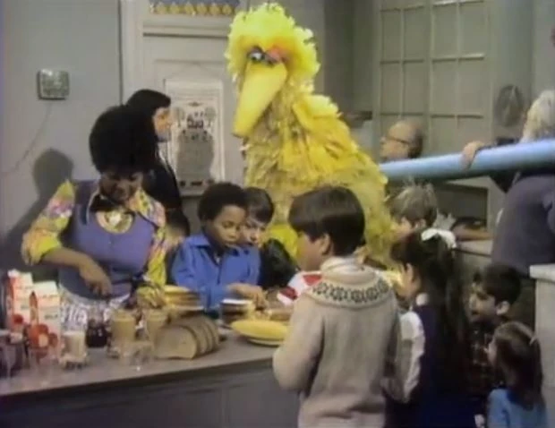 | SCENE 7 | Susan is in a rush as Gordon has invited all the kids over for sandwiches and milk. Soon, the room is full of about a dozen kids (including Sally and Jay) who help make more sandwiches. Even more people arrive, including Mr. Hooper and "the old man down the street" carrying a long rolled-up tube for some reason, Big Bird, and a random "little boy." Bob announces the sponsors and the book read on today's show as the chaos continues. | |