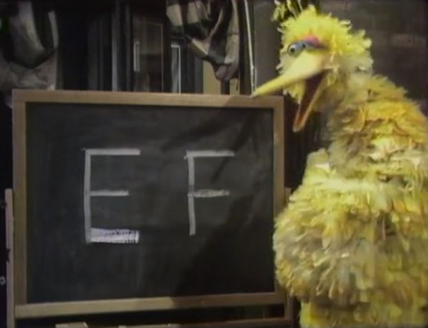 | SCENE 2 | Big Bird draws an E and F on the drawing board, with an arrow pointing to the E to show that he understands the difference now. He briefly leaves to find Gordon, and the line on the E disconnects itself and attaches itself to the F. Gordon compliments Big Bird on the attempt but is taken aback by his "perfidious penmanship." Big Bird is confused--he's sure he wrote the letters properly. The line on the E disappears as Big Bird has his back turned, making two F's. Big Bird is confused again when Bob comes around and compliments his two F's. The mischievous line finally reappears at the bottom of the E, and Big Bird's happy to know he was right all along but goes to his nest to lie down, just as the line disappears once again... | |