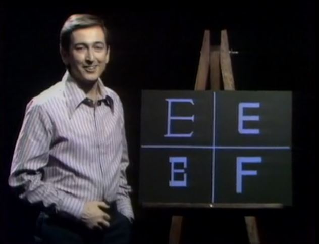 | SCENE 6 | Bob plays two rounds of "Three of These Things" with the viewer, first with three E's and an F, then with three F's and an E. (Blooper: at the end of the second game, Bob mistakenly points to one of the F's, and catches his mistake when going over the correct answer.) | |