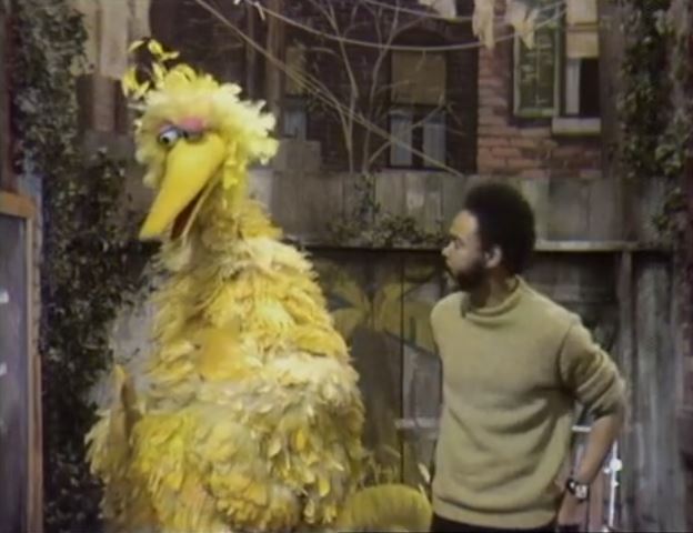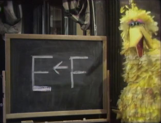 SCENE 1 | Big Bird singsongingly boasts that he can draw letters better than anybody else on the block and instantly recognizes any letter he sees. His claim is put to the test when he, Gordon, and the kids look up and see Alphabet Bates skywriting a letter (First: Episode 0061). When Big Bird incorrectly guesses that it's the letter F, Gordon explains that it's actually the letter E and introduces a segment to show what an F really looks like. |