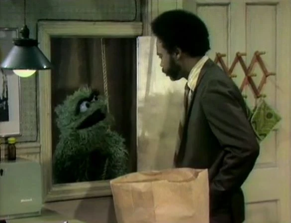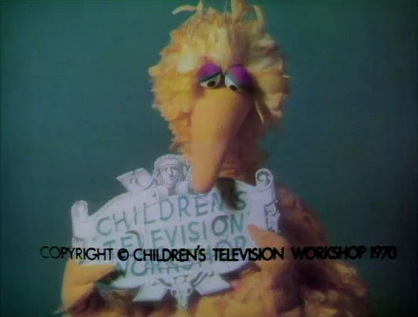 CLOSING SIGNS | Oscar and Bob hold the Sesame Street sign, and Big Bird holds the Children's Television Workshop sign. |