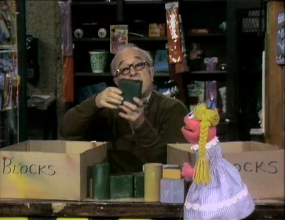 SCENE 4 | Mr. Hooper and a little girl Muppet sort blocks by form, but a couple of the blocks float from one group to the other. Mr. Hooper catches them and puts them in the right place, telling them to stay put so he will know where they are. Susan comes in asking for a box of mixed blocks, which gives Mr. Hooper mixed feelings. |