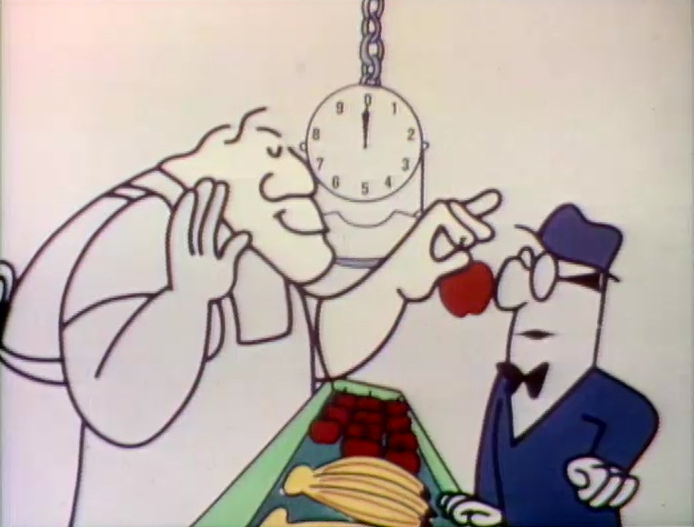 Cartoon | A man goes to the grocery store to buy apples, but he can't decide how many to get. This frustrates the grocer, who has to keep adding and subtracting the amount of apples on his scale. Artist: Cliff Roberts (First: Episode 0132) |