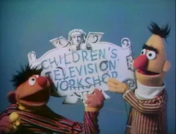CLOSING SIGNS | Big Bird holds the Sesame Street sign, and Ernie and Bert hold the Children's Television Workshop sign. |
