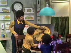 SCENE 7 | Susan sets out some shapes and numbers for the kids to figure out what to make from them: a clock. When she asks them what time it is, Oscar the Grouch appears in the dumbwaiter and reports that it's time to watch... |