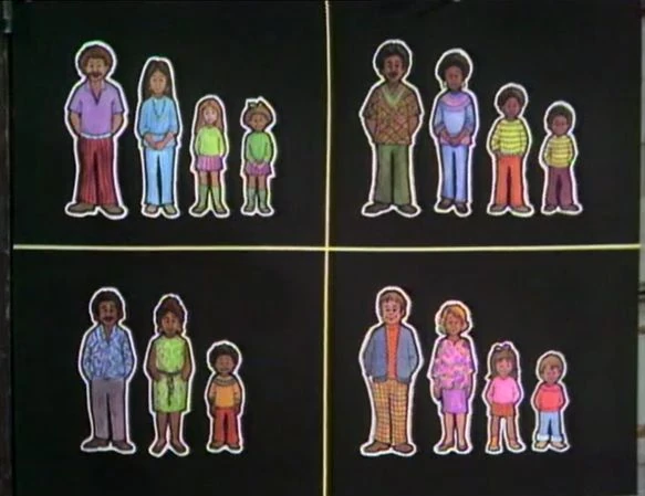 SCENE 5 | Susan plays a "Three of These Things" game with Oscar and the kids using four pictures of families. Though all of the families look different, only one group has three members and the rest have four. Oscar comments that he was an only child, with the exception of his brother. |