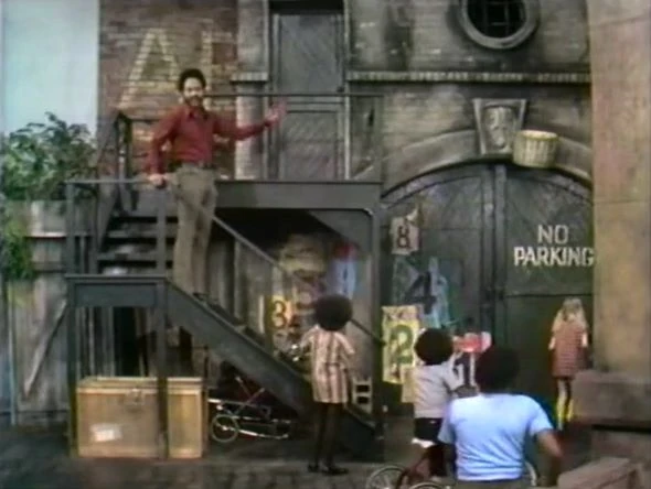 Gordon dons an engineer's cap as Chris, Ronald, and Kate form a line on the gate wall of 123 Sesame Street. They pretend to be a train β another T word. |