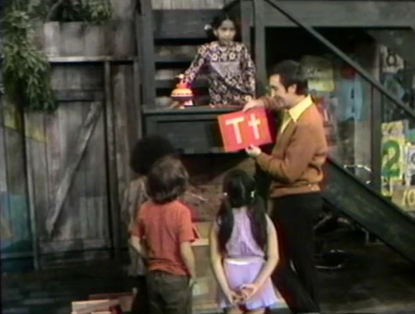 SCENE 3 | Bob shows the kids a card with a capital and small T. He points out to them that "toys" begins with T. |