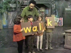 SCENE 3 | Gordon and the kids spell the word "walk" using letters printed on signs. The kids demonstrate how they can spell it with their eyes closed, and their mouths closed; Frannie and Mauricio attempt to spell it with their legs crossed. |