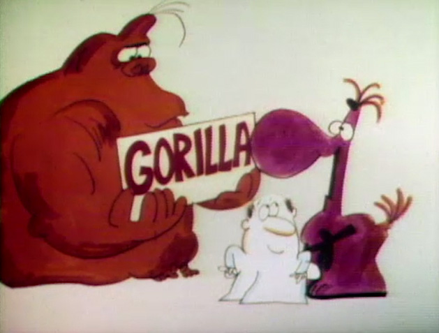 Cartoon | A man asks a purple fellow what G word is behind a circus curtain. It's a gorilla. Artist: Film Fair (First: Episode 0085) |