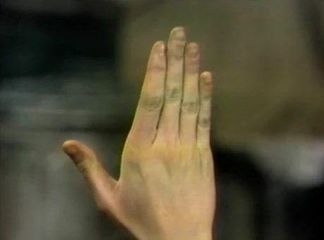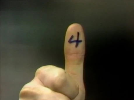 SCENE 6 | A hand appears onscreen as Bob tries to count its four fingers. The thumb keeps inserting itself into the proceedings, eventually revealing a number 4 painted on itself. |