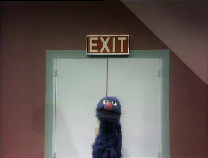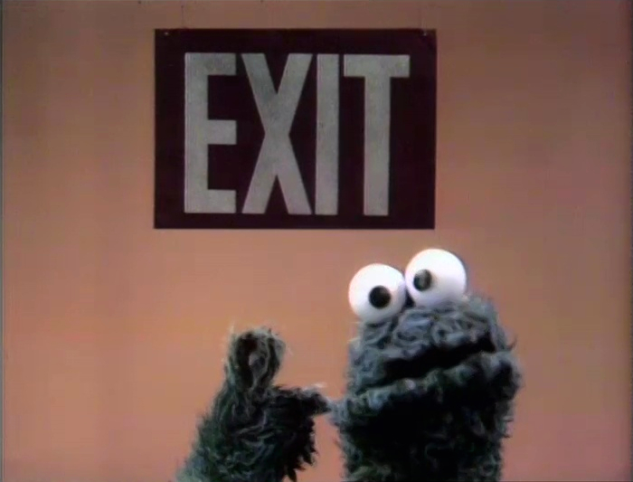 Muppets | Cookie Monster: Exit β Following the sign's direction, Cookie Monster makes an exit. |