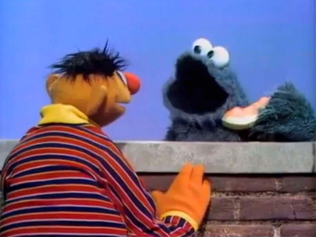 Muppets | Cookie Monster and Ernie: Wall Toss β Ernie talks about what happens next when he throws over a wall. (First: Episode 0148) |