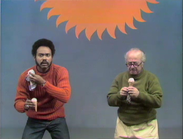 Cast | In front of a prop cutout of the sun, Gordon and Mr. Hooper eat ice cream cones wearing heavy sweaters. Without using dialogue, the two communicate to one another that it's hot out and agree that they should both remove their sweaters. After struggling for a moment, kids in voiceover tell them to cooperate, and they get the task done. (First: Episode 0193) |