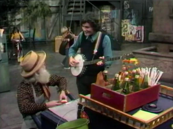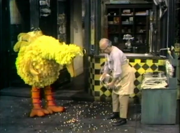 SCENE 6 | Big Bird continues walking backwards and accidentally bumps into Mr. Hooper, who spills the jellybeans he was carrying in a jar. Big Bird wants to rectify the situation, but Mr. Hooper stops him knowing that he's usually spilling things. Big Bird surmises that he seems to be doing everything backwards today, so Mr. Hooper reluctantly hands him the jar. To his amazement, the situation is solved and all the jellybeans spill up back into the jar! |